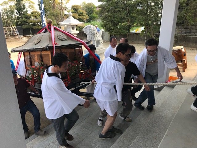 宮入では、神猿と神狐が神社の拝殿から伸ばした縄(ロープ)を神輿の横棒に巻きつけ、神様のご帰還を願って待ち受ける男衆が引っ張ります。神様が神社に帰ってしまうと祭が終わってしまうので、そうはさせまいと、それに対抗して神輿担ぎの男衆が抵抗します。その駆け引きが何度も繰り返され、祭は愈々佳境に入ります。神輿は必死に抵抗するも、精根尽き果てて遂に拝殿の中へ引き込まれました。無事神様が宮居にお戻りになり、宮総代の柳本様を中心に拝礼で締めくくりました。本日はおめでとうございました。